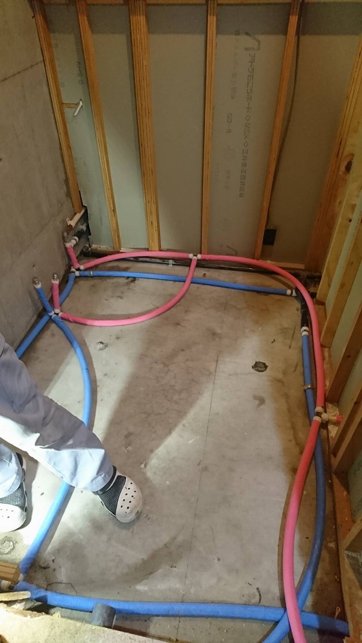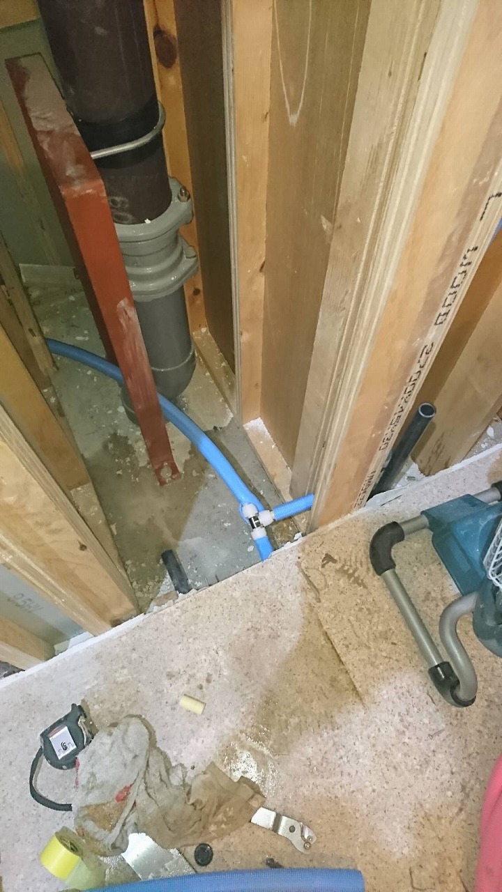 今回は洗面室の真横にトイレがあったので洗面室の壁を外してから配管取替を行いました。