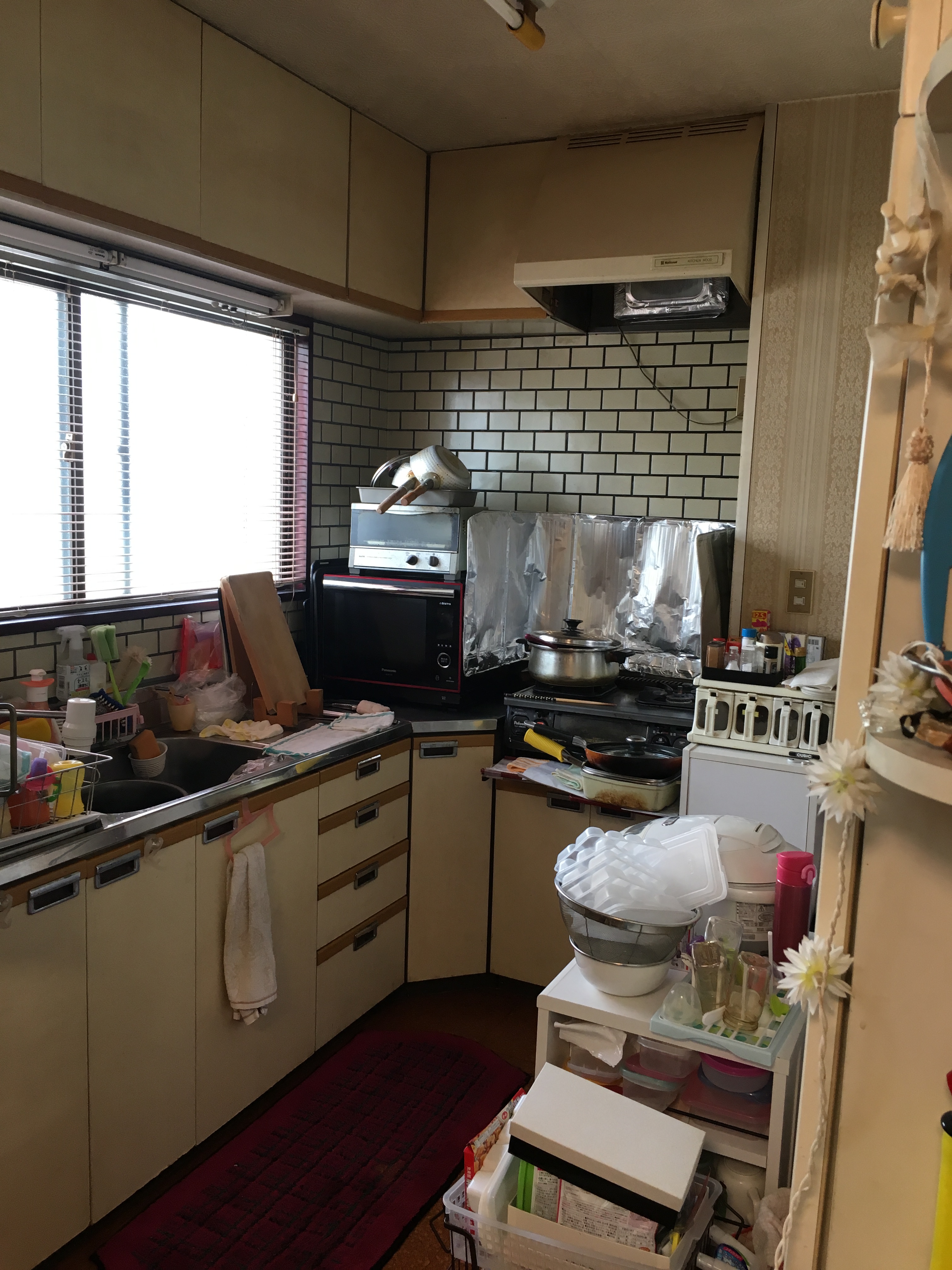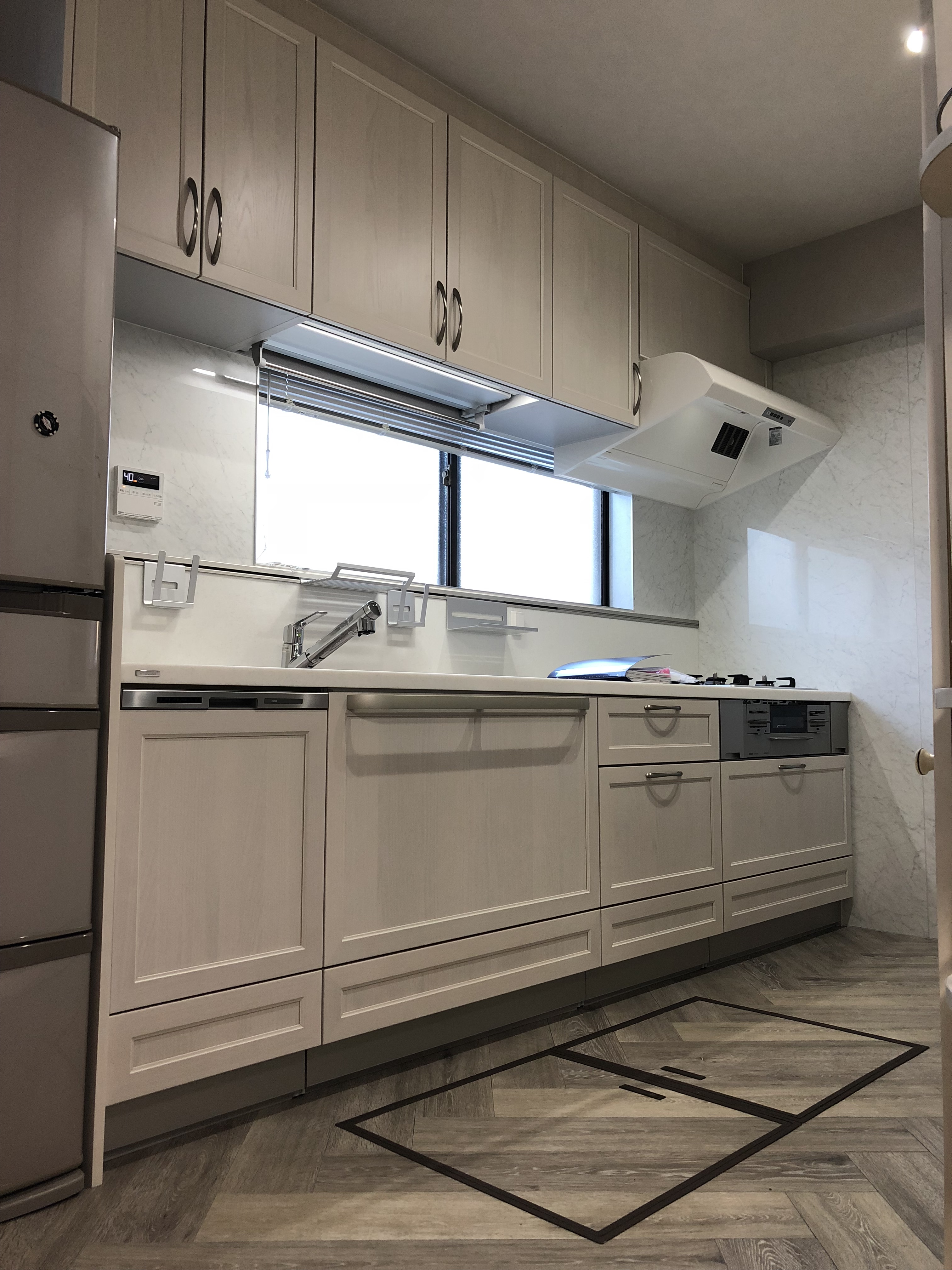 元々がL型キッチンで使い勝手が悪く、タイル等の汚れも気になり始めリフォームさせていただきました。