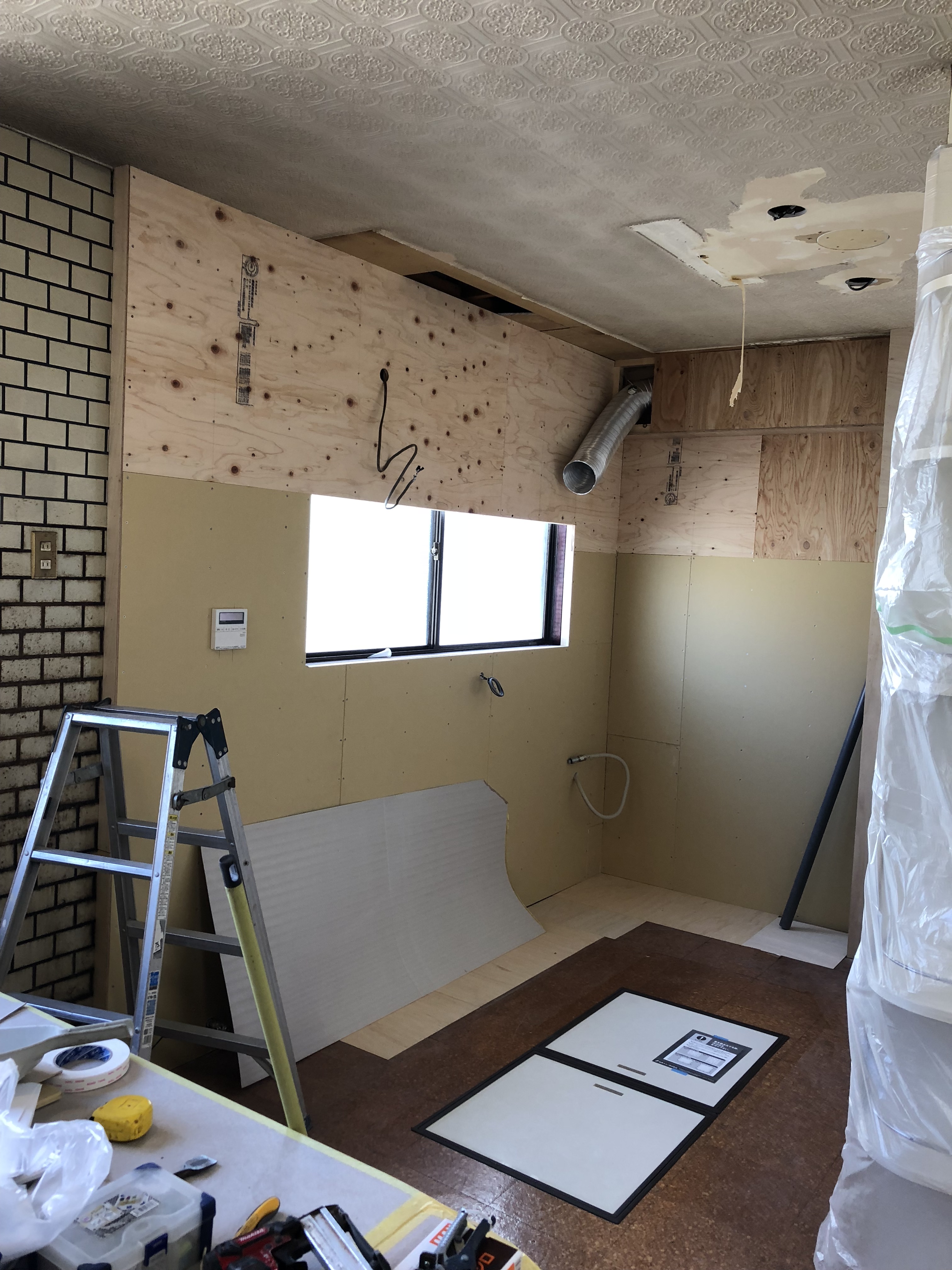 キッチンを撤去して、新しいキッチンに合わせた壁の補修、給排水管の取替を行います。