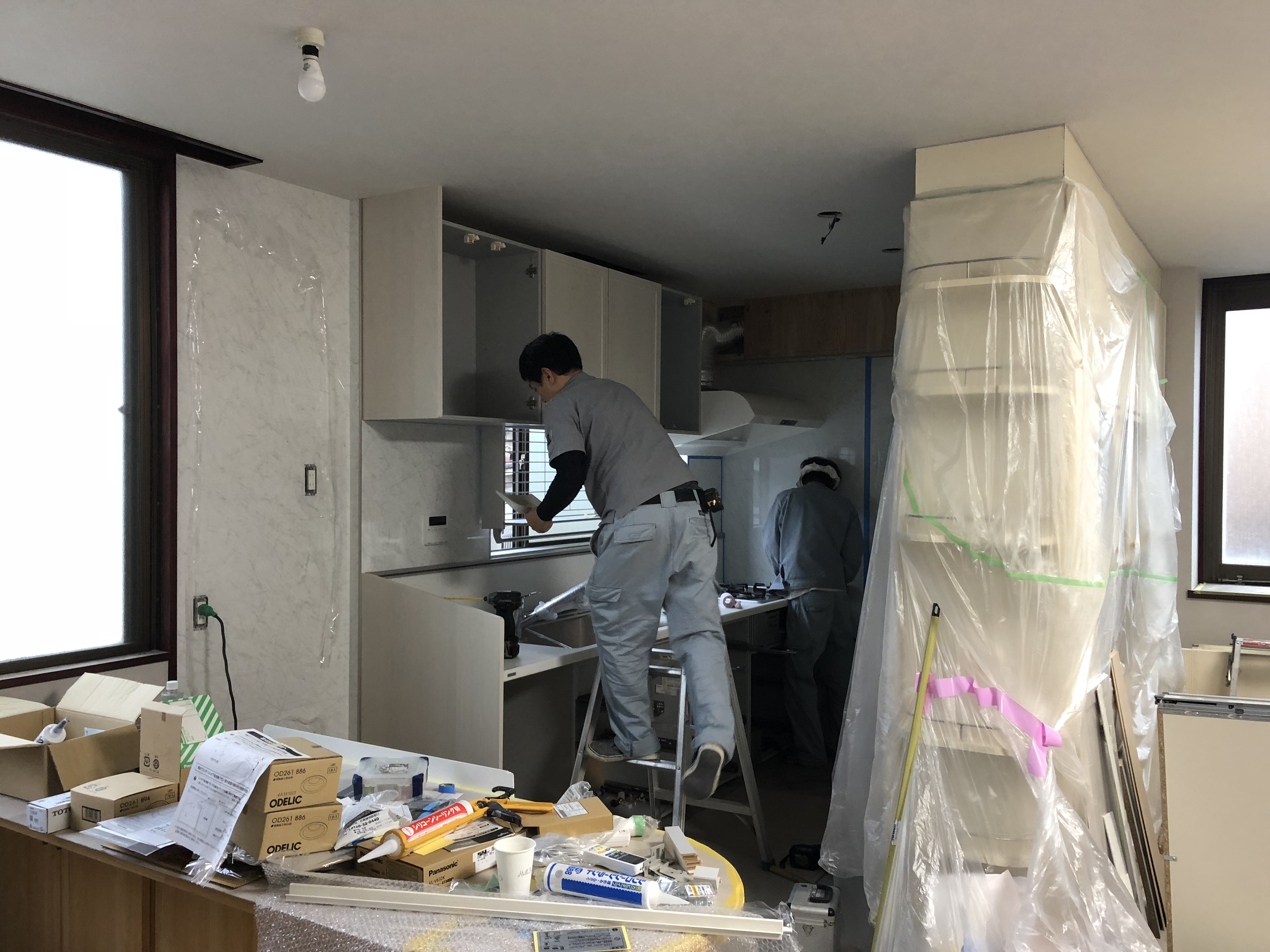 1日掛けて、システムキッチンを一つ一つ組み立てていきます。