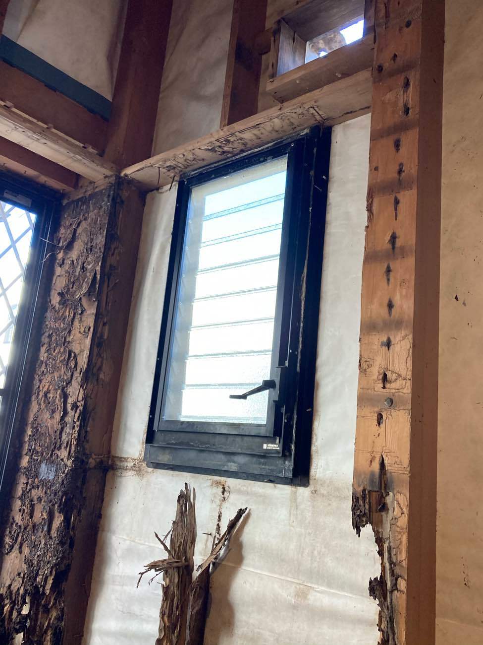 柱・筋交い・土台などに食害が酷くでており、サッシもギリギリなんとかついていた状態でした。