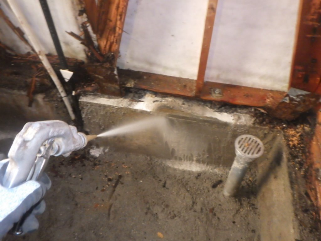 生息箇所への防蟻材噴霧施工中です。ユニットバスを据える前に木材へ噴霧します。