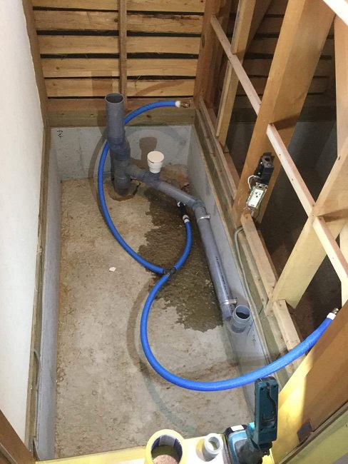 こんな感じで、トイレ取付位置の変更や手洗器新設に伴い、排水管や水道管の工事が必要になってきます。