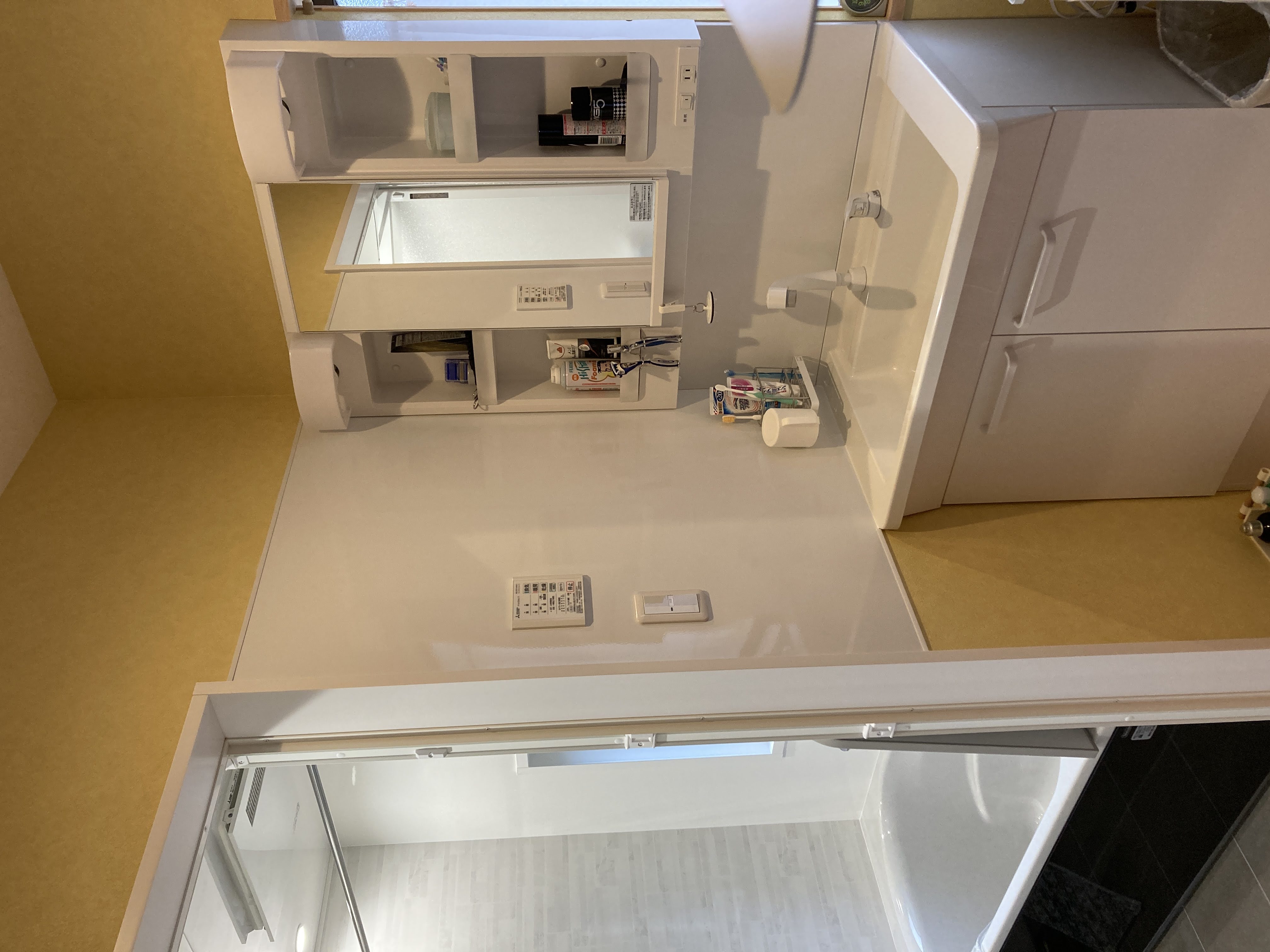 洗面台は以前改修された洗面台がまだ新しかったので、再利用し、左側面にタカラスタンダードのホーローパネルを貼り付けています。