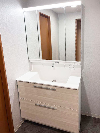 洗面台のサイズを大きくしてスペースの無駄をなくしました。鏡も大きくなりデザインもスタイリッシュでホテルのような仕上がりに満足しています。