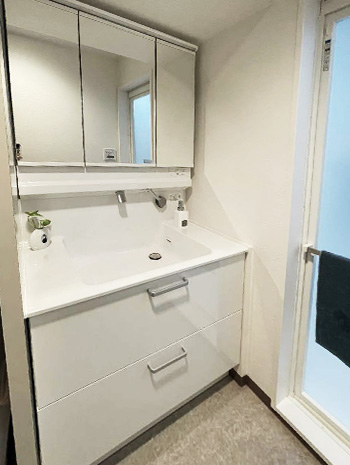 真っ白で清潔感のある洗面台をセレクト。引き出しタイプ+3面鏡内収納ですっきりと収まります。水栓が上についているので水垢や飛び散りも気になりません。
