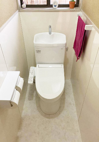 節水タイプのトイレで1回の洗浄量は4~5リットルと従来のトイレの半分の為、日々の節水にもつながります。ウォシュレットはTOTO SBシリーズから選定して費用をご希望価格におさえました。